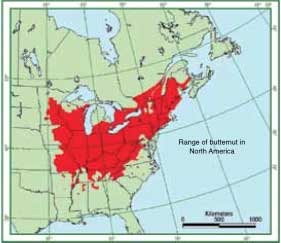 Figure 2: The range of butternut in North America. (Ontario Ministry of Natural Resources and Environment) |