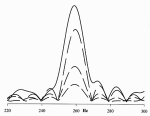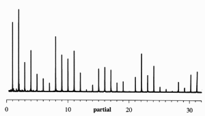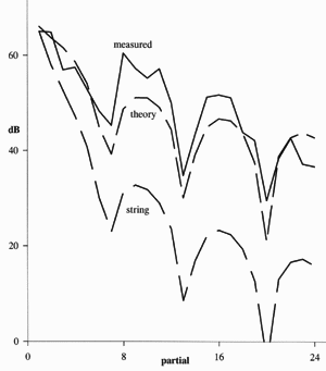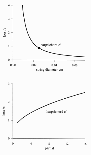 P.M.Morse, Vibration and Sound. 1936. N.H.Fletcher, Analysis of the Design and Performance of Harpsichords. Acustica 37,139 1977. M.Goodway & J.S.Odell, The Metallurgy of 17- and 18th-century music wire. 1987. W.R.Savage et.al, Air and structural modes of a harpsichord. JASA 91(4):2180-9 1992. N.H.Fletcher & T.D.Rossing, The Physics of Musical Instruments. 1998. There is an error in the viscosity damping equation in both their 1st and 2nd edition (a different error in each). | ![]() ![]() tap tone spectrum