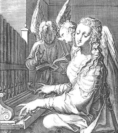 We are all taught smooth thumb-under technique today. The key to smooth playing with finger crossovers is that the hand should point towards the key to be played next (Tomas de Santa Maria, 1565). One can make a very fluid legato by 'walking' the long fingers along the keyboard this way. Most naturally, though, it creates an articulate legato that corresponds to wind-players double-tonguing "tu-ru-tu-ru" This is not choppy-sounding, nor does it separate the passage-work into groups of 2 or 3. Rather, it creates a musical line which is speech-like. There are many early art works that show this technique. One of the most famous is reproduced here, St.Cecilia by H.Goltzius ca.1588. (It reappeared 25 years later on the title page of Parthenia, with a virginal substituted for the organ, and with no keys depressed!)