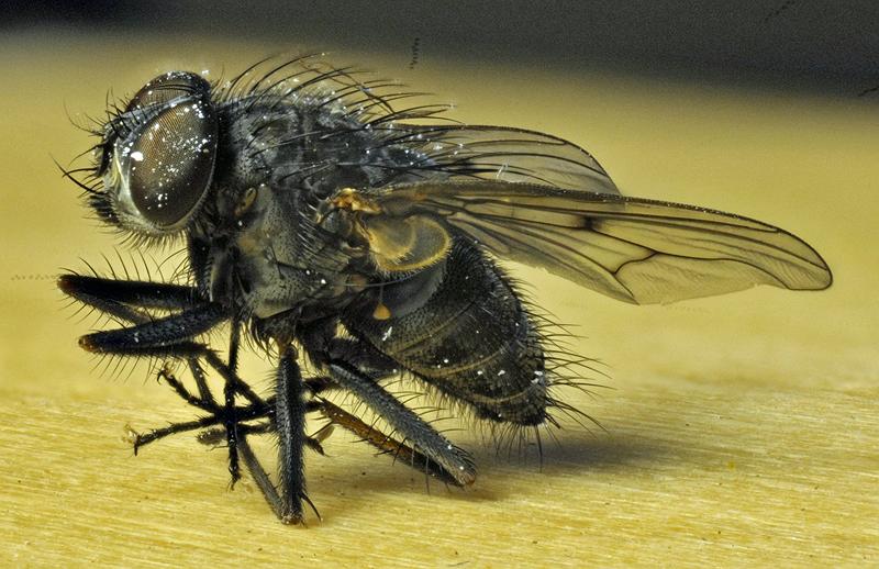 Calliphora vomitoria: This blow fly feeds on decaying meat and feces both as adult and larva.