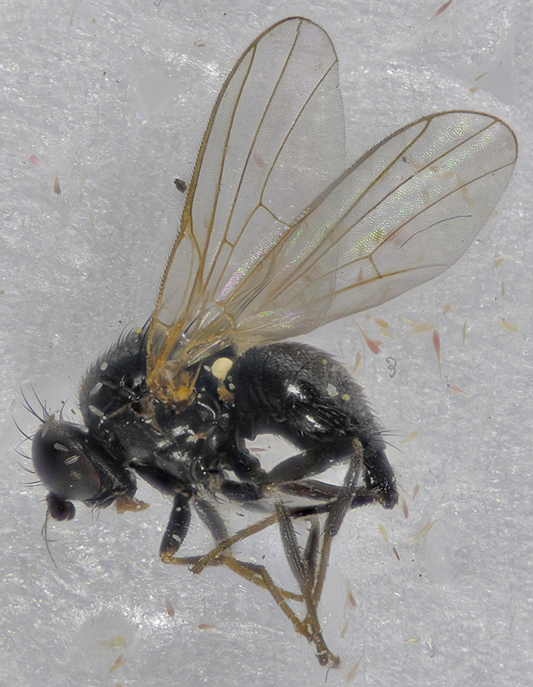 Thricops nigrifrons: These flies eat pollen; their bright orange calypteres stand out. Length 7 mm.