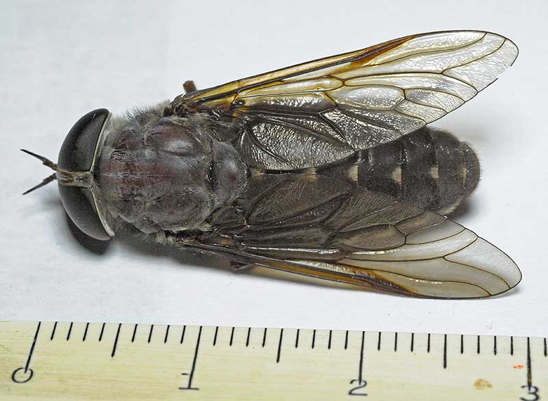 Tabanus catenatus: Adults feed on nectar and plant exudates; females bite animals to obtain protein from blood to produce eggs. The mouthparts of females are formed into a stout stabbing organ with two pairs of sharp cutting blades, and a spongelike part used to lap up the blood that flows from the wound. Length 30 mm.