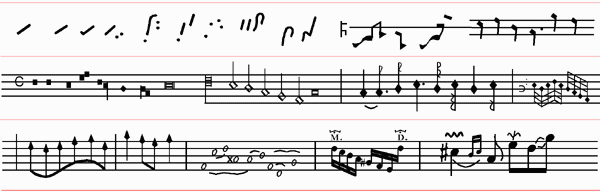 I show my planned design here (in three rows to fit Web resolution - the actual design is one long strip). From left to right, the top row is 9th century neumes, 11th century (Winchester Troper), 12th century Italian, 12th century English; 2nd row 13th century (Sarum Antiphoner), 1530 (John Taverner), 1607 Monteverdi's Orfeo (the first printed score), 1659 (Christopher Simpson); 3rd row 1689 (Musick's Hand-Maid, Henry Purcell), 1705 French (Gaspard Le Roux), 1750 Spanish (Domenico Scarlatti), 1888 German (Chrysander edition of François Couperin).