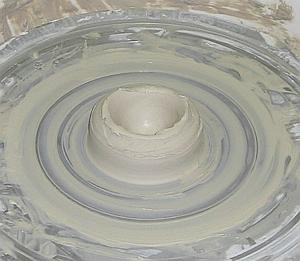 which is steady. The instant the clay moves off center, stop shaping and get it centered again. If you feel a spiral forming, it means you are applying too much rotational force - reflatten the clay and start over with more water on your hands and use less pressure. Flatten the clay to the width of the bowl by pressing with one hand on the top while keeping it centered with the other. Unless making a small simple piece, repeat this process - some do it three times, others cut the clay off the wheel, invert it, then repeat. Clay is made of flat particles (platelets) and they must be aligned along all surfaces or the piece will contract too much when drying and crack. Clay must flow. Learning the feel of flowing clay is your first task as a potter. A center hole is made with a thumb and opened to the inside bottom diameter of the bowl. Using one hand heel on the outside, and the fingers of the other on the inside, persuade the clay to take up roughly the shape of the final bowl. This must be done slowly enough that the clay platelets are aligned horizontally rather than in a spiral. The walls are best made a bit thicker and higher than the final product; the excess will be removed during trimming. (The more expert the thrower, the less they need to trim.) Shape the underside with a wooden knife. Avoid using fingers on the underside: the silica in clay is a potent abrasive and the clay-coated wheel surface will quickly eat through finger nails. |