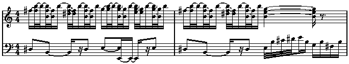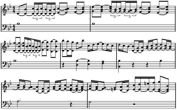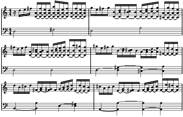 Bach was renowned for his singing legato style on the harpsichord. If every detail of every note is precisely noted in a score exactly as Bach would have played it, it is far too complicated to read. But it sounds gorgeous! (In this and all following examples, the notation has been chosen to show sustains as clearly as possible - articulation, tempo changes, and other details have been removed for clarity.)