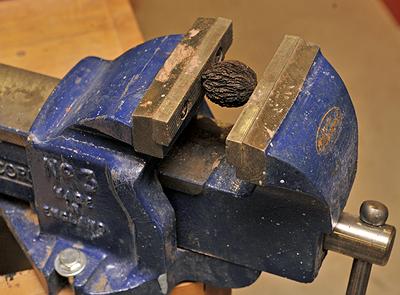 A more precise method is a machinist's vise. This gives perfect control, as a good vise is so rigid that the shell is cracked precisely as much as you wish. Taking your time allows a significant fraction of half-kernels. |