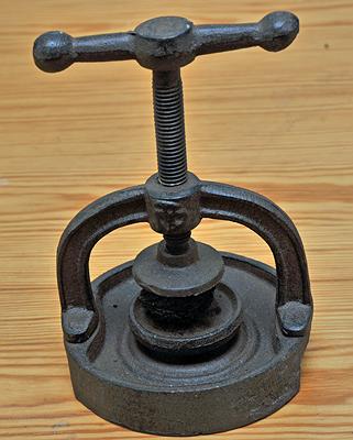 | Despite the appearance, this cast iron cracker is new. Made in China, it also comes in bright baked enamel colours. However, it's inefficient to use - the wells in the anvils are so deep that many turns of the screw are needed between the opening that permits the nut to be inserted and that which cracks the nut. Also, the vertical space available for the nut is much smaller than the thread, so some large nuts don't fit in. The arch is held on by screws, so the unit could be taken apart and the excessive edges filed down, but I haven't bothered to do it. |