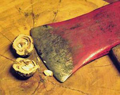 The easiest small scale way to open black walnuts is by splitting or cutting them. My grandfather Wallace did it with stump and axe, but with the skill of a lifetime splitting wood for a stove. I also use an axe, but not having my grandfather's skill, place its edge on the suture and smack the axe with a wooden mallet. |