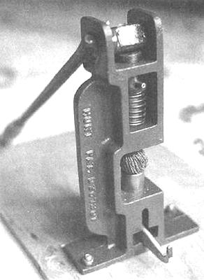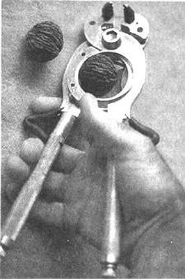 This massive cast iron vertical cracker was made (and patented of course) by Lawrence Hunt in 1982. It uses a wedge to adjust an anvil to the position required by the nut being cracked. It, and several similar designs, are still sold. One is sold in Canada by Grimo Nut Nursery. |