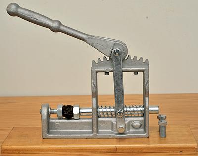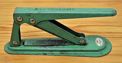 | This light weight forged aluminum cracker has a lever advantage of 50x; it was made by Teague during the 1950's and offers the option of table-edge mount or bench mount. Its maximum opening of 85mm is larger than any nut I've ever seen |