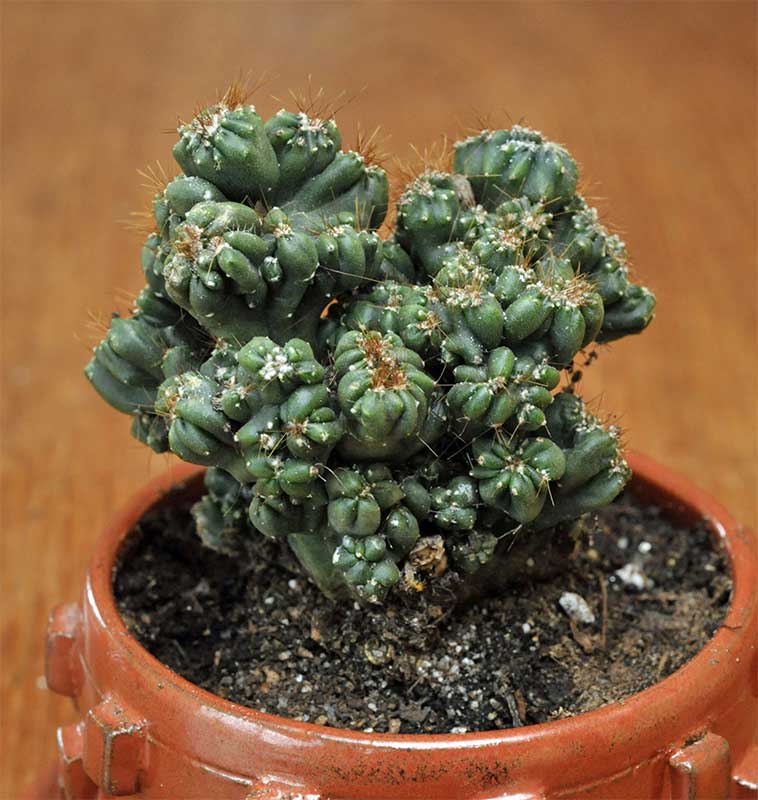 | Opuntia vestita, cristata form. The regular form is from South America; cristata forms rarely bloom. Tightly folded cristata cacti are sometimes called brain cacti. No one is sure what modifies the growing tip (meristem) to cause these mutations. |