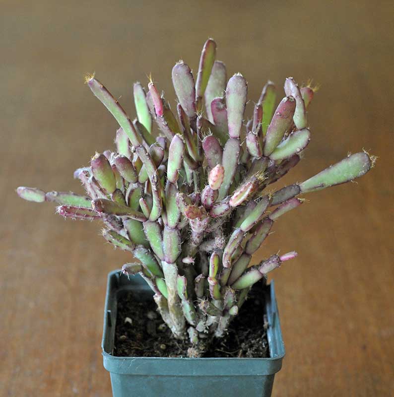 | Hatiora rosea from Brazil, known as the Easter Cactus from its blooming time, is an epiphyte in its natural habitat. When grown in soil, the roots need access to air or it rots. It needs a cool (but non-freezing) winter to bloom, cooler than most North American homes. |