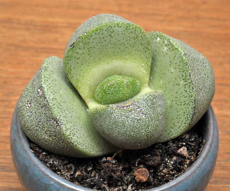 | Anacampseros rufescens is native to western South Africa; although this one looks dehydrated compared to most of its genus, it's growing well. |